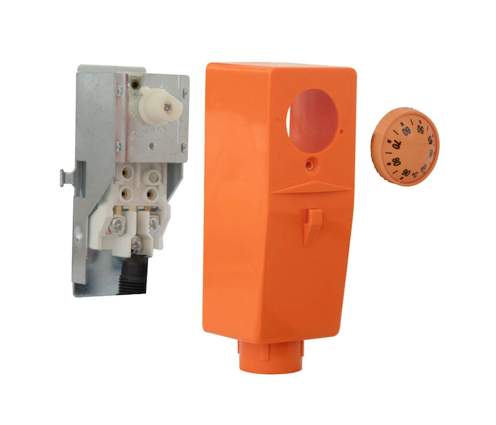 Příložný termostat v kompaktním provedení s bimetalovým čidlem, nastavitelnou teplotou zvenku a montáží přímo na trubku speciální pružinou. Vhodný např. pro podlahová topení, ke spínaní oběhových čerpadel v závislosti na nastavené teplotě a hysterezi.