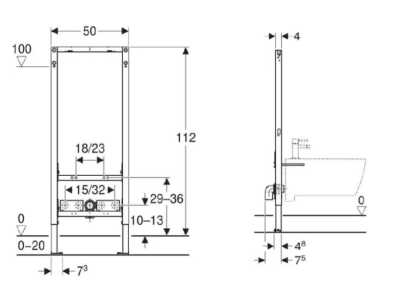 - Rozteč upevnění závěsného bidetu 18 nebo 23 cm