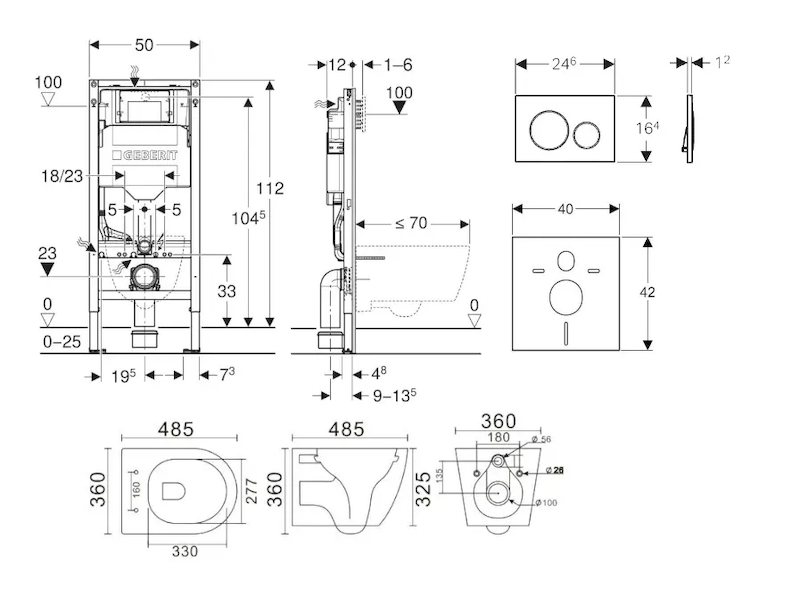 - k montáži do systémových stěn Geberit Duofix částečně vysokých nebo vysokých na výšku místnosti