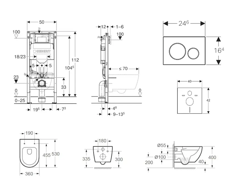 - k montáži do systémových stěn Geberit Duofix částečně vysokých nebo vysokých na výšku místnosti
