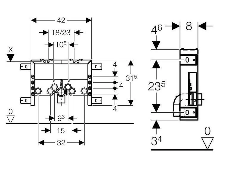- Rozteč upevnění závěsného bidetu 18 nebo 23 cm