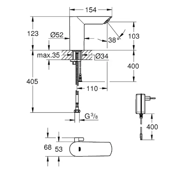 Grohe Bau Cosmopolitan E - Infračervená elektronická umyvadlová baterie se směšovacím zařízením, napájení ze sítě 230 V, chrom 36453000