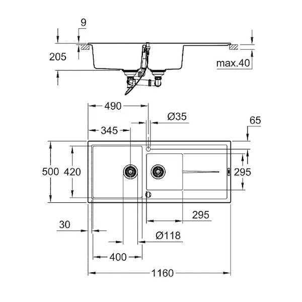 - velikost sektoru dřezu: 400 x 420 x 205 mm, velikost 2 sektoru dřezu: 295 x 295 x 205 mm