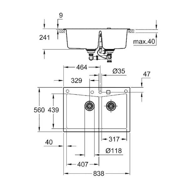 - velikost sektoru dřezu: 406 x 438 x 241 mm, velikost 2 sektoru dřezu: 316 x 438 x 241 mm