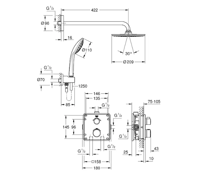 - natištěné symboly pro hlavovou a ruční sprchu