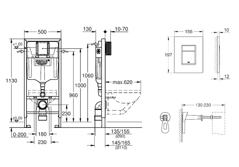 Grohe Rapid SL - Předstěnový instalační set pro závěsné WC, výška 1,13 m, ovládací tlačítko Skate Cosmopolitan, chrom 38772001