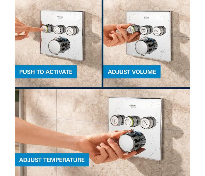 - GROHE SmartControl - umožňuje snadné ovládání, jednoduše nastavitelný zdroj proudu vody od úsporného po plný proud pouhým otočením tlačítka