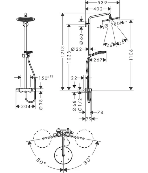Nástěnná sprchová souprava Showerpipe 280 obsahuje