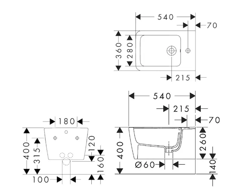 Závěsný bidet 540 s otvorem pro baterii a přepadem