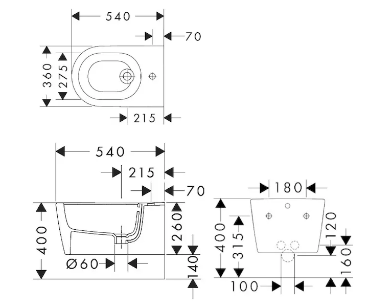 Závěsný bidet 540 s otvorem pro baterii a přepadem