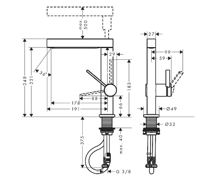 - výtokové rameno lze vytáhnout jako spršku až o 500 mm