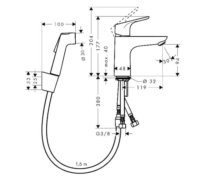 Součástí dodávky je páková umyvadlová baterie s ruční sprchou Bidette, přívodní hadice, držák sprchy, sprchová hadice, odtoková souprava, upevňovací materiál, montážní návod.