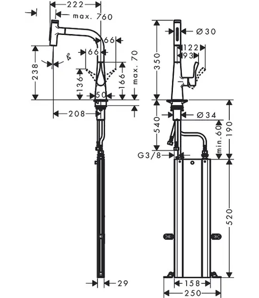 - hadice se vytahuje až 76 cm a zaručuje příjemnou práci a volnost pohybu v okolí dřezu