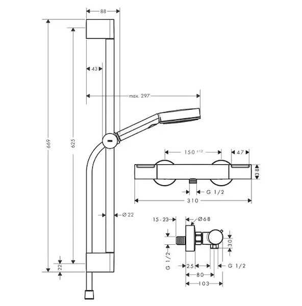 - otočný a výškově nastavitelný jezdec k uchycení ruční sprchy