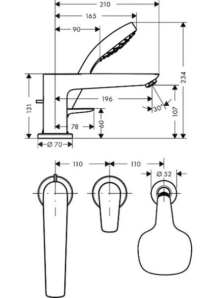 - 3-otvorová páková armatura na okraj vany, ruční sprcha