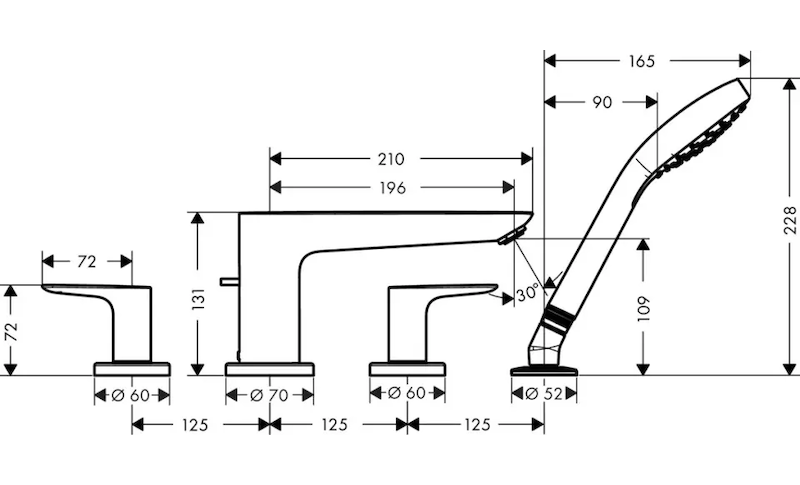 - 4-otvorová armatura na okraj vany, ruční sprcha, sprchová hadice