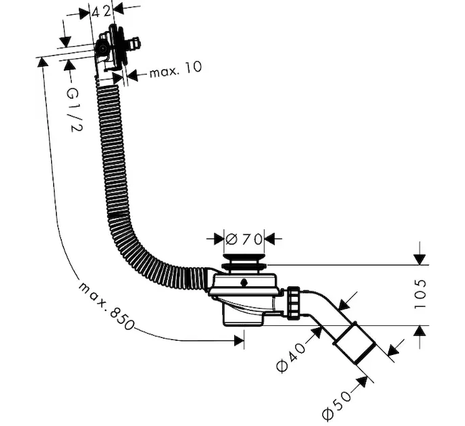 Hansgrohe Tubset universal - Základní těleso pro vanovou odtokovou a přepadovou soupravu s napouštěním, délka 85 cm 58152180