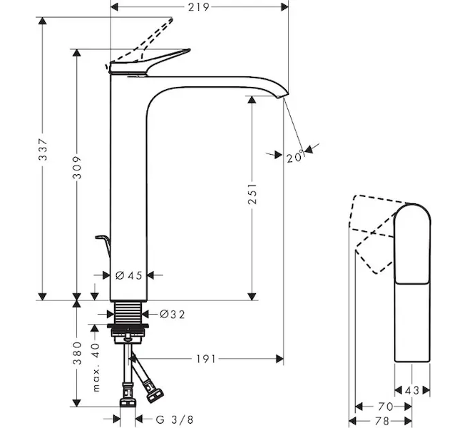 Vivenis Páková baterie 250 CoolStart pro umyvadlové mísy s odtokovou soupravou s táhlem