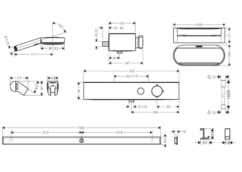 Hansgrohe WallStoris - Set sprchové hlavice 105, 3 proudy, termostatu a koupelnových doplňků, matná černá 24250670 skladem u dodavatele 2 ks |