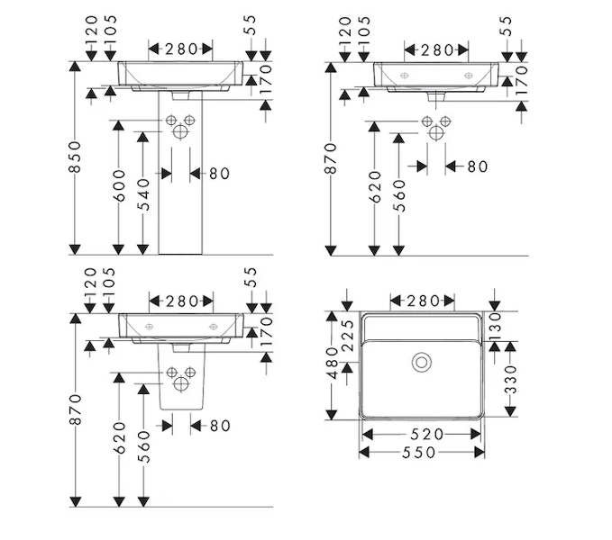 Umyvadlo 550/480 bez otvoru pro baterii, bez přepadu