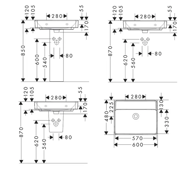 Umyvadlo 600/480 bez otvoru pro baterii, bez přepadu