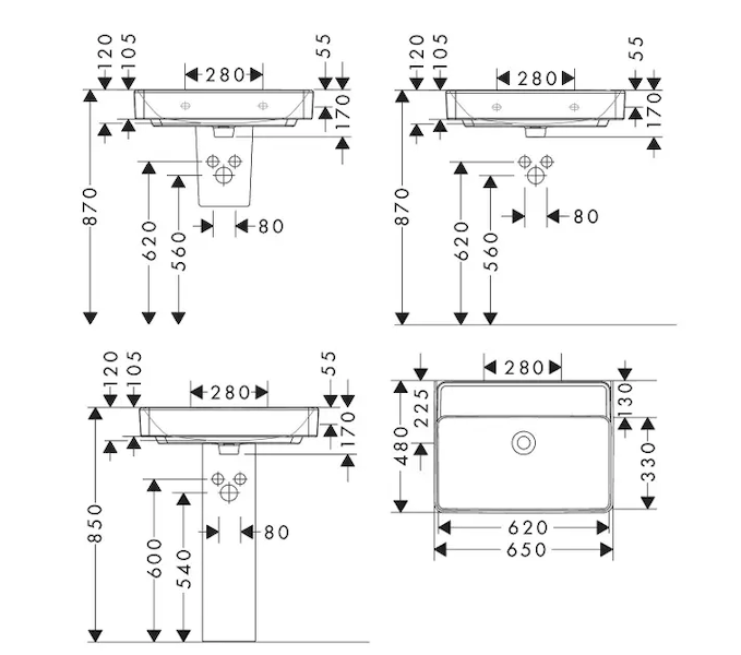 Umyvadlo 650/480 bez otvoru pro baterii, bez přepadu