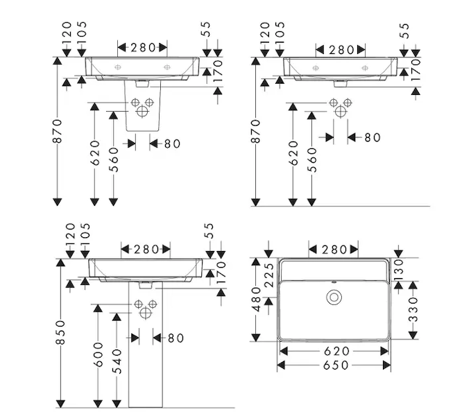 Umyvadlo 650/480 bez otvoru pro baterii, s přepadem