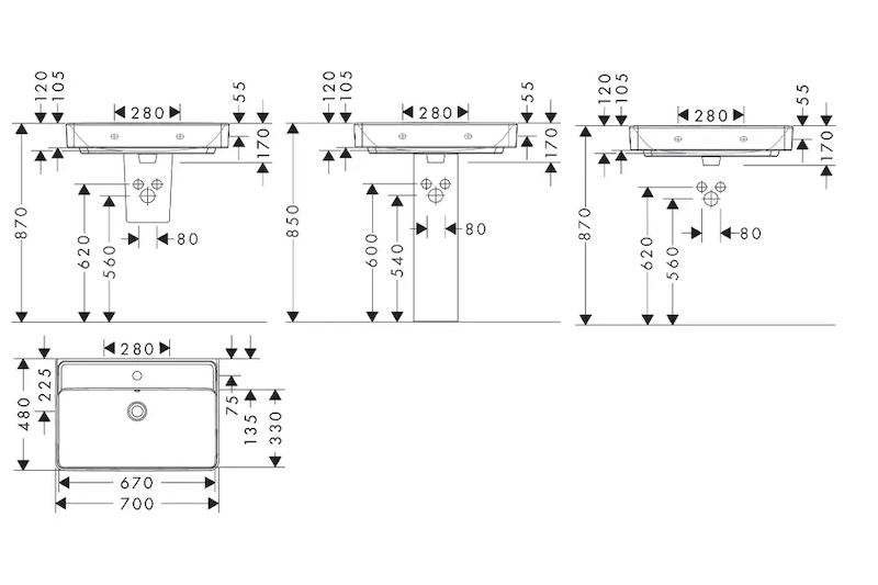 Umyvadlo 700/480 s otvorem pro baterii, s přepadem