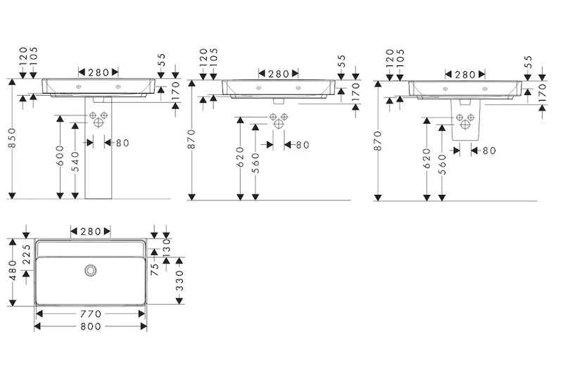 Umyvadlo 800/480 bez otvoru pro baterii, bez přepadu
