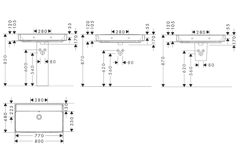 Umyvadlo 800/480 bez otvoru pro baterii, s přepadem