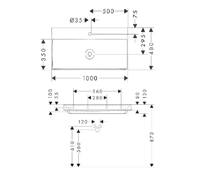 Xelu Q Umyvadlo 1000/480 s otvorem pro baterii, bez přepadu