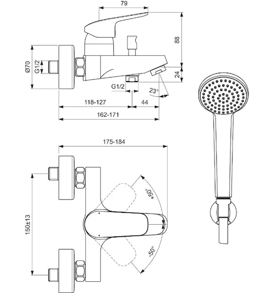 - součástí balení kovová sprchová hadice 1500 mm, sprchová hlavice průměr 80 mm, pevný držák sprchy