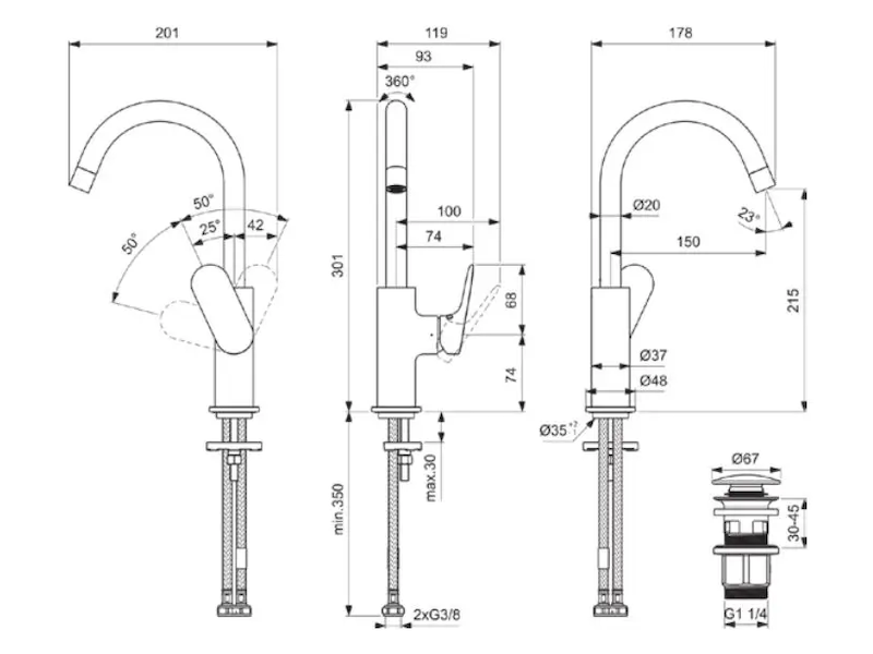 Ideal Standard Ceralife O - Umyvadlová baterie s otočným výtokem a výpustí Click-Clack, hedvábná černá BE016XG Obvykle 1-2 měsíce |