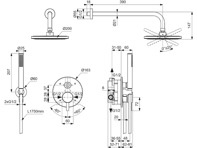 - připojovací závit a připojení do zdi G 1/2