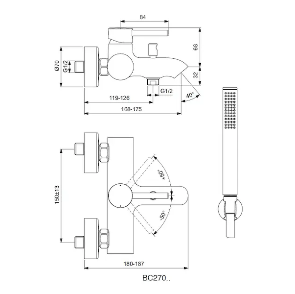 Ideal Standard CeraLine - Vanová nástěnná baterie s příslušenstvím, černá BC270XG