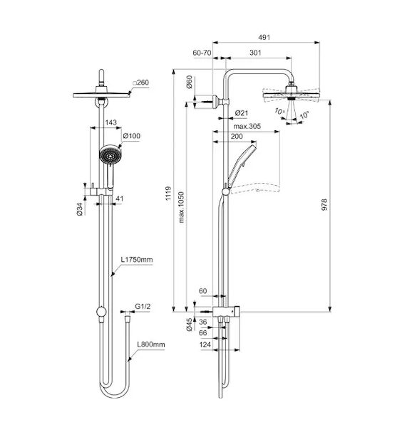 - s posuvným držákem ruční sprchy s možností nastavení úhlu