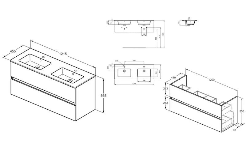 - rozměr dvojumyvadla: 155 x 1215 x 455 mm (VxŠxH)