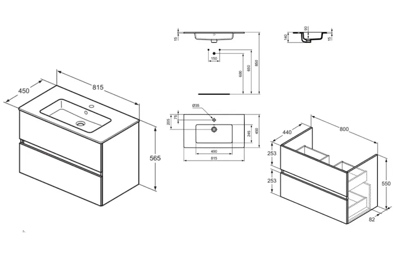 - rozměr umyvadla: 140 x 815 x 450 mm (VxŠxH)