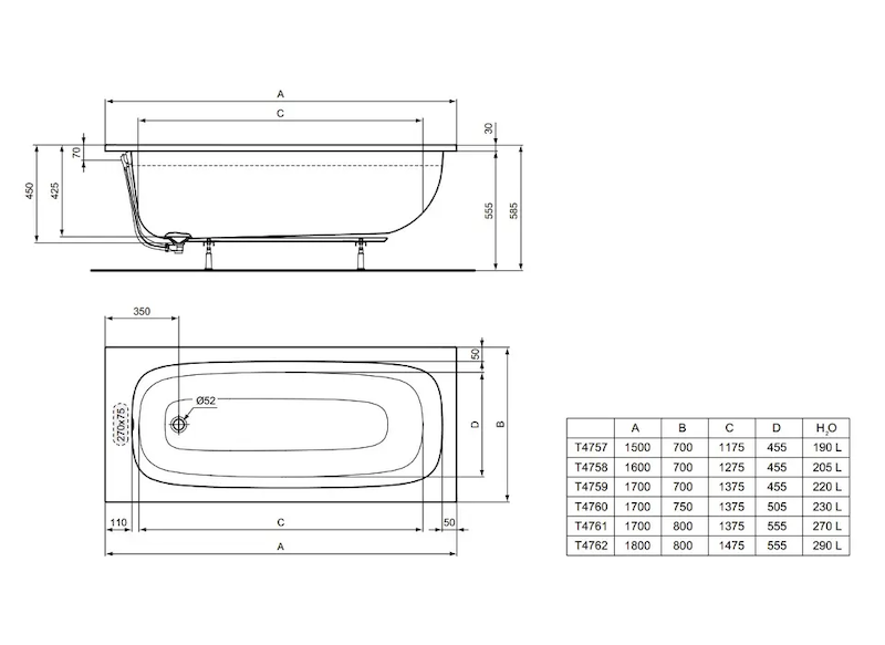 - odtok: průměr 52 mm