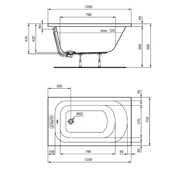 - odtok: průměr 52 mm, boční umístění
