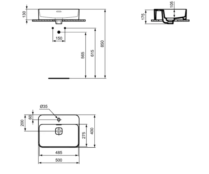 Umyvadlo na desku s otvorem pro baterii uprostřed