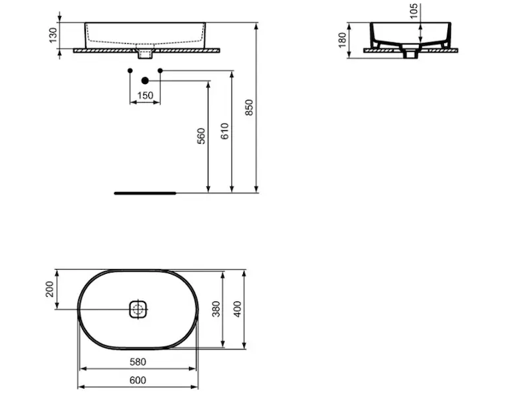 Oválné umyvadlo na desku bez otvoru pro baterii