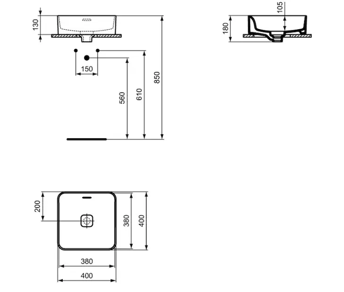 Umyvadlo na desku ve tvaru čtverce bez otvoru pro baterii