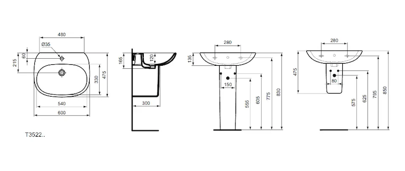 Ideal Standard Tesi - Umyvadlo 60x48 cm, s přepadem, otvor pro baterii, bílá T352201