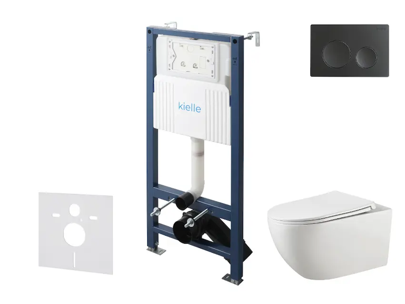 kielle Genesis New - Set předstěnové instalace, klozetu Gaia, Rimless, sedátka softclose a tlačítka Gemini New I, matná černá 30528SS12