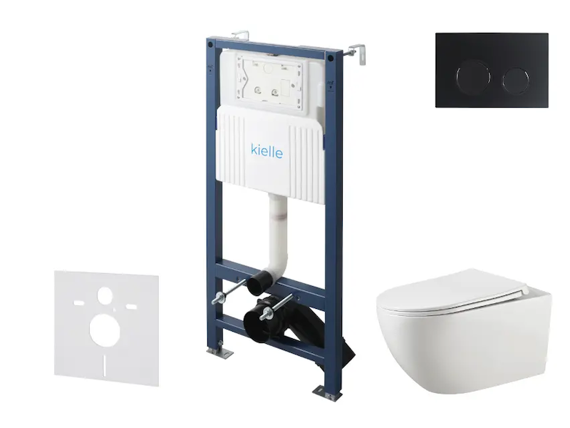 kielle Genesis New - Set předstěnové instalace, klozetu Gaia, Rimless, sedátka softclose a tlačítka Gemini New II, matná černá 30528SS15