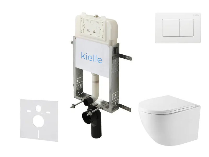 kielle Genesis New - Set předstěnové instalace, kompaktního klozetu Oudee, Vortex Rimless+, sedátka softclose a tlačítka Gemini New III, lesklá bílá 30528SZ43
