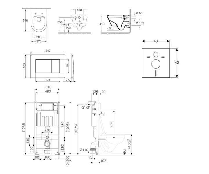 - fixační set pro uchycení WC mísy: 2x závitová tyč M12, 4x podložka, 2x krytka, 2x matice, 2x chránička závitu