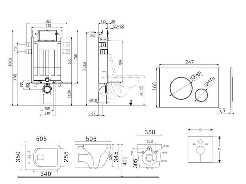 - Fixační set pro uchycení WC mísy: závitová tyč M12 – 2 ks, podložky – 4 ks, krytka – 2 ks, matice – 2 ks, chránička závitu – 2 ks