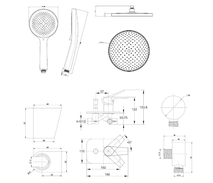 - sprchové rameno k instalaci na stěnu, délka 350 mm, materiál mosaz, povrchová úprava chrom